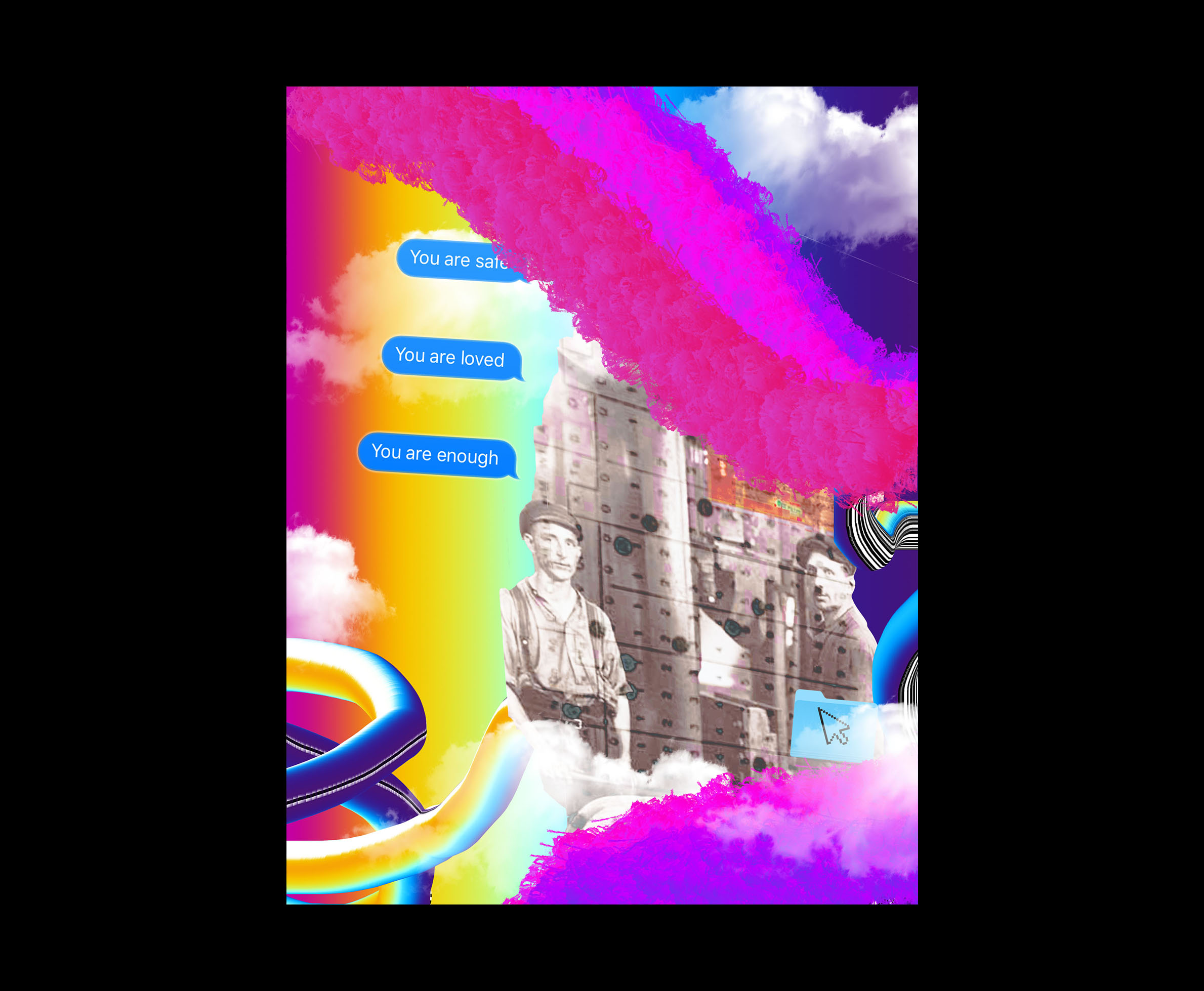 The posters depict the development of technology and the impact it has on our lives. Bright colours and computer icons were used to contrast old imageries and pushes the audience to question the authenticity of the digital world and social media presence. The posters are displayed as a quadriptych.
